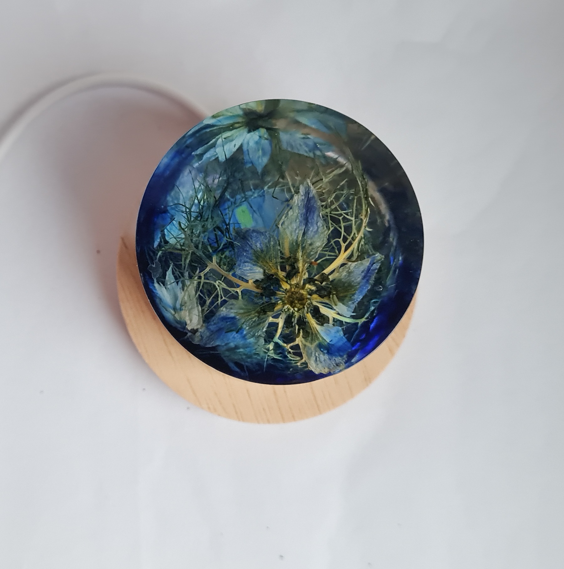 Lampka z zatopionymi kwiatami w żywicy epoksydowej.