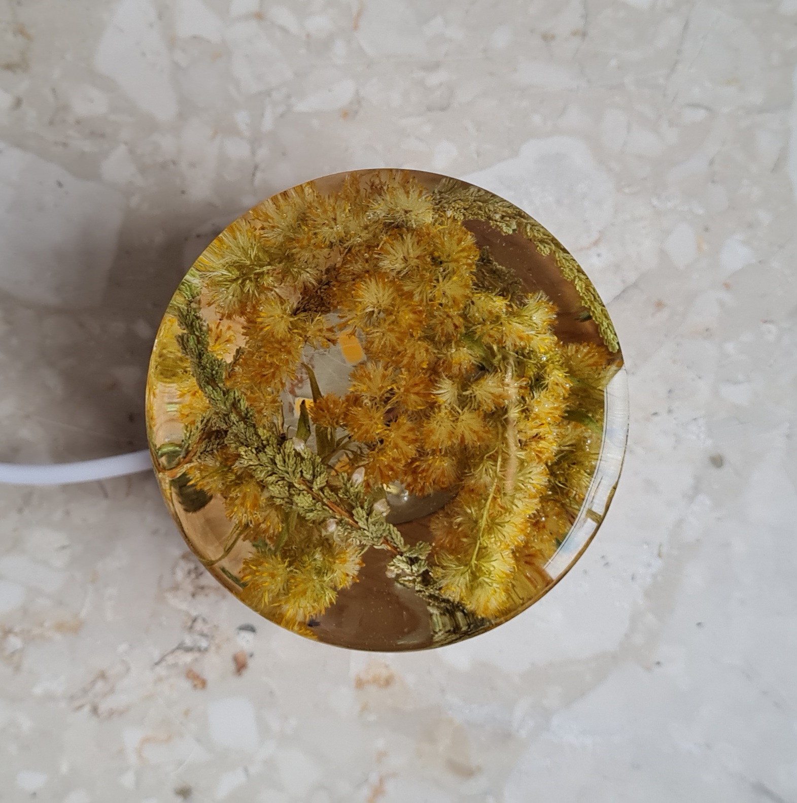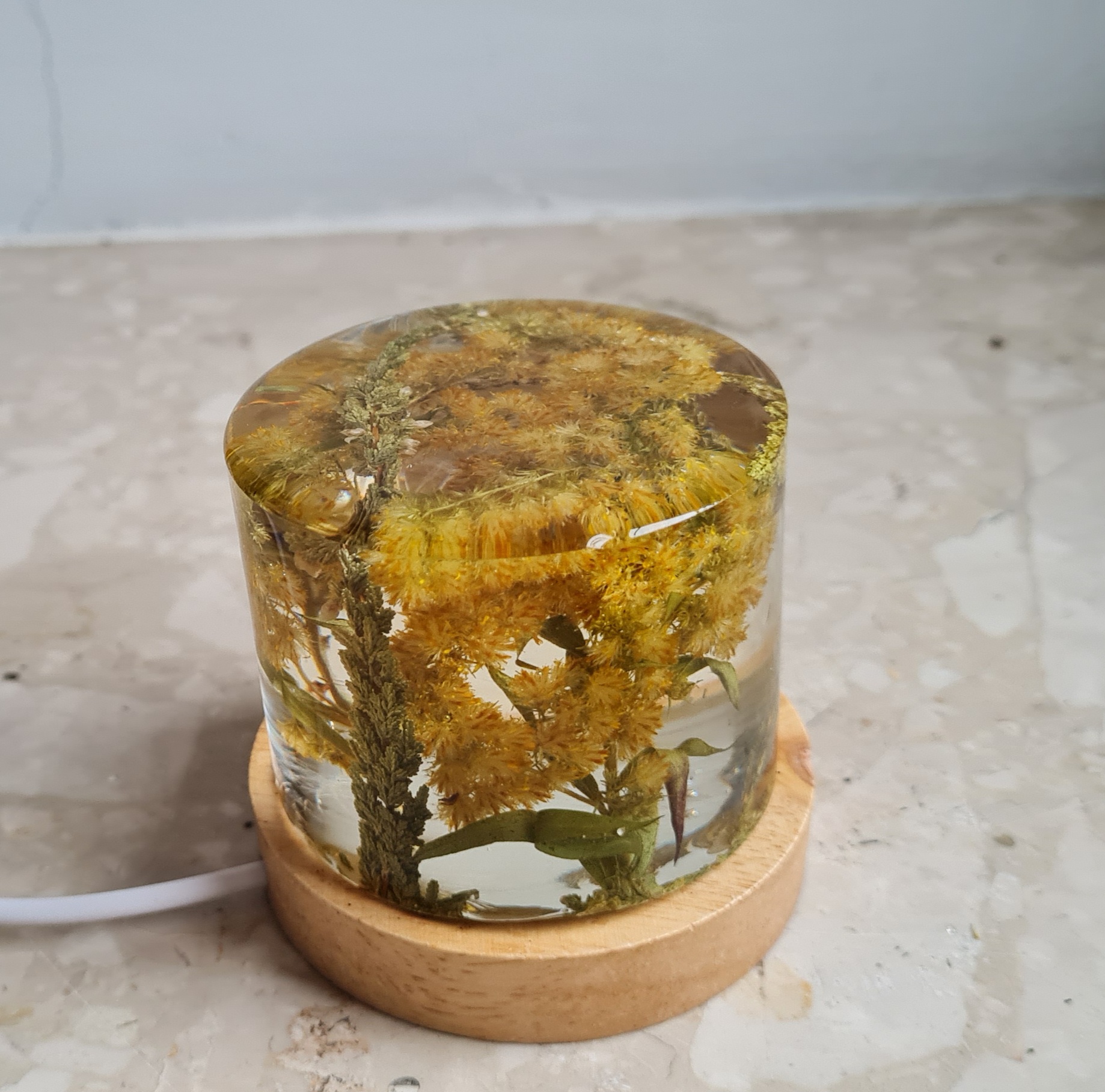 Lampka z zatopionymi kwiatami w żywicy epoksydowej.