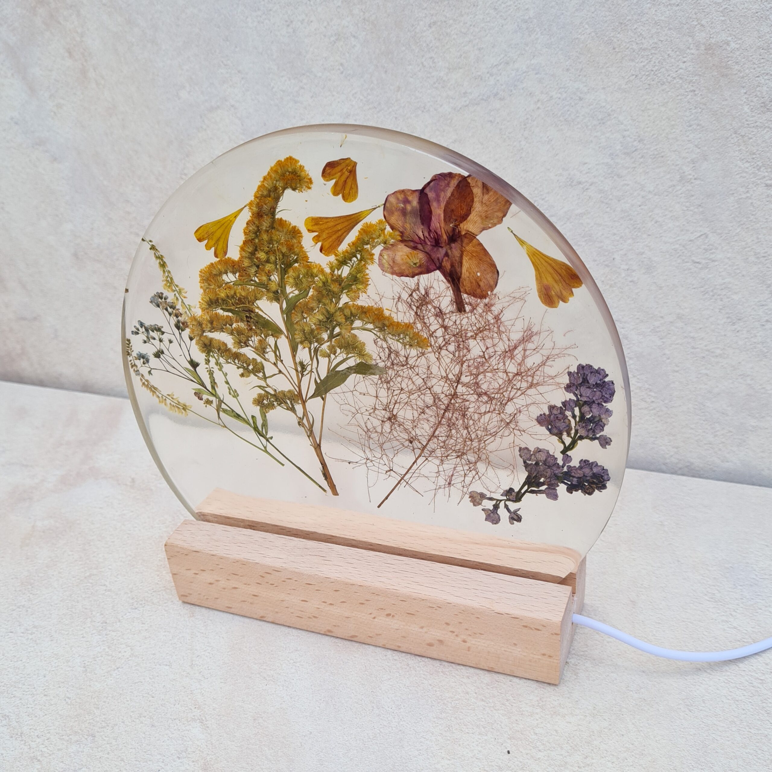 Lampka z zatopionymi kwiatami w żywicy epoksydowej.