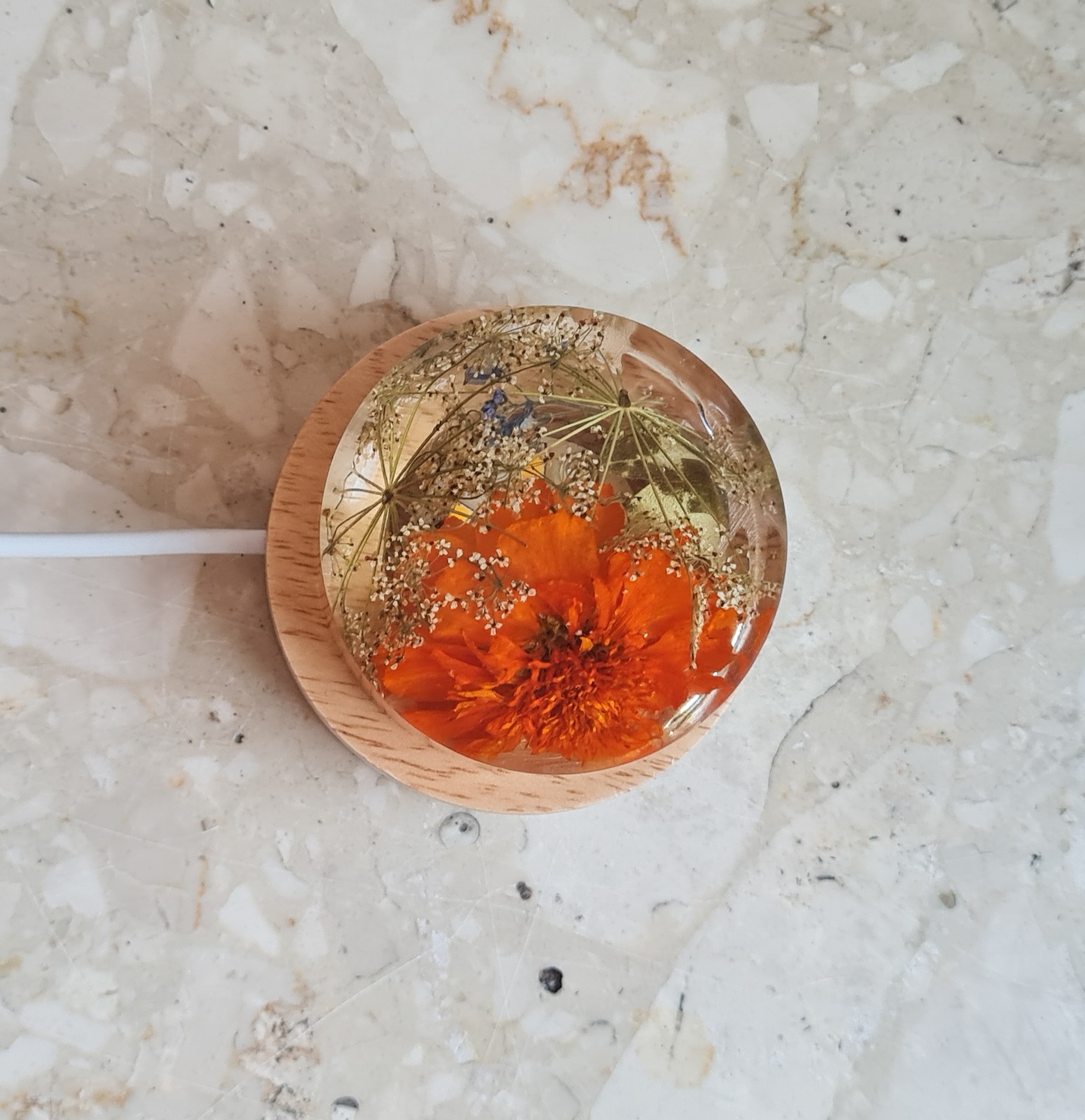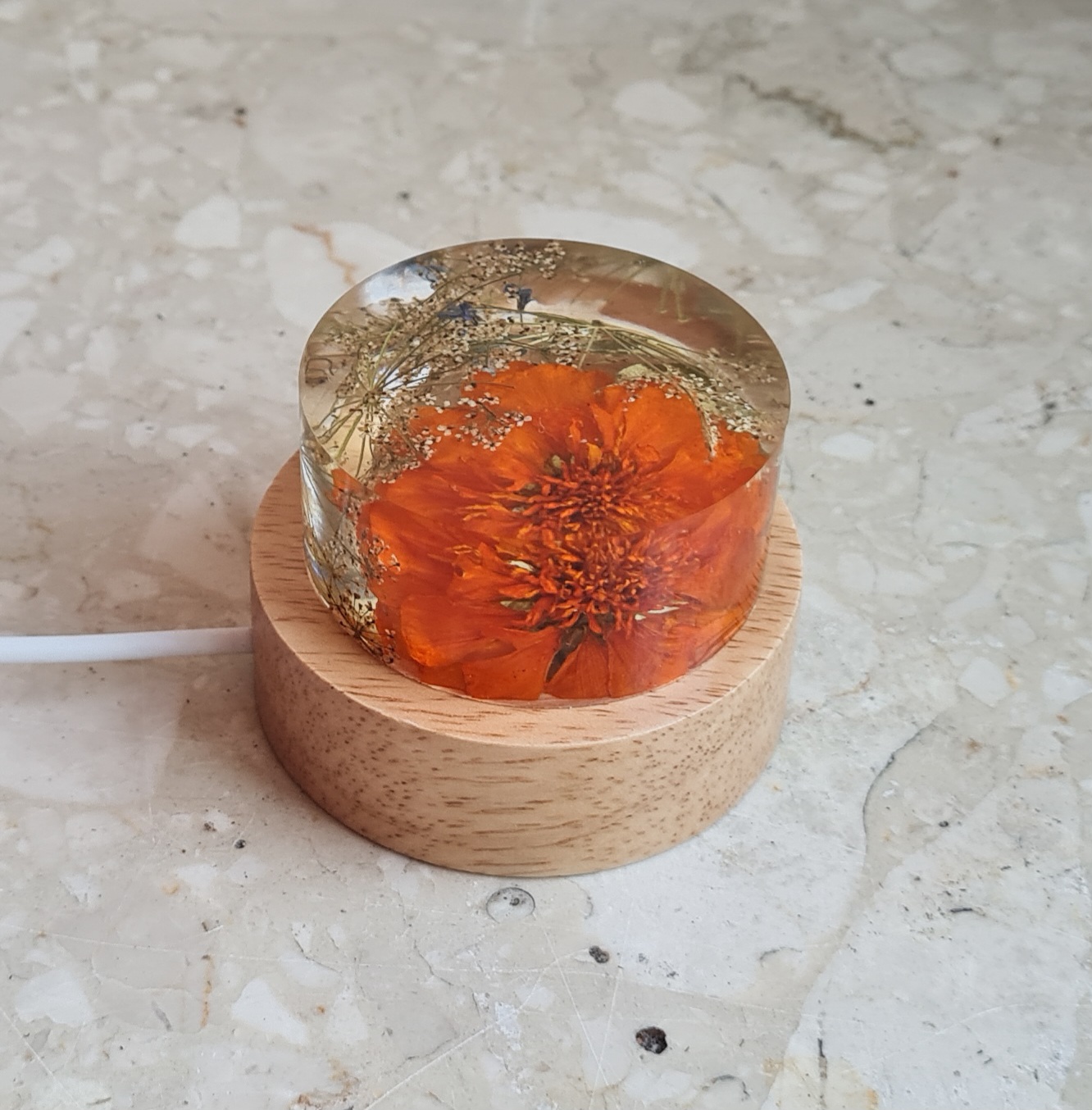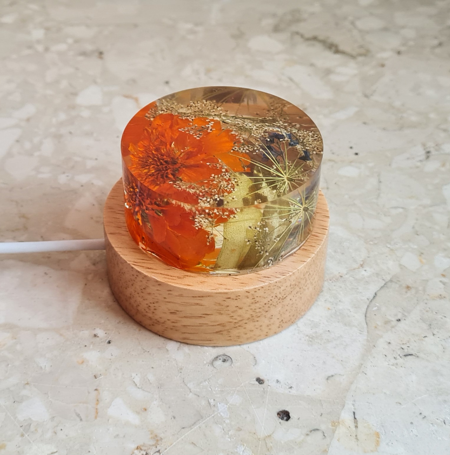 Lampka z zatopionymi kwiatami w żywicy epoksydowej.