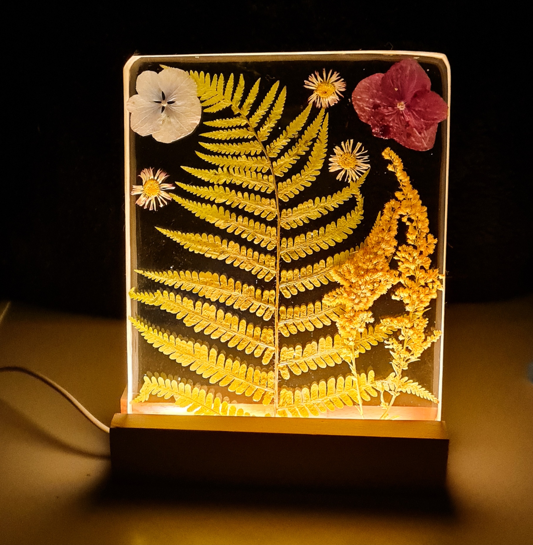 Lampka z zatopionymi kwiatami w żywicy epoksydowej.
