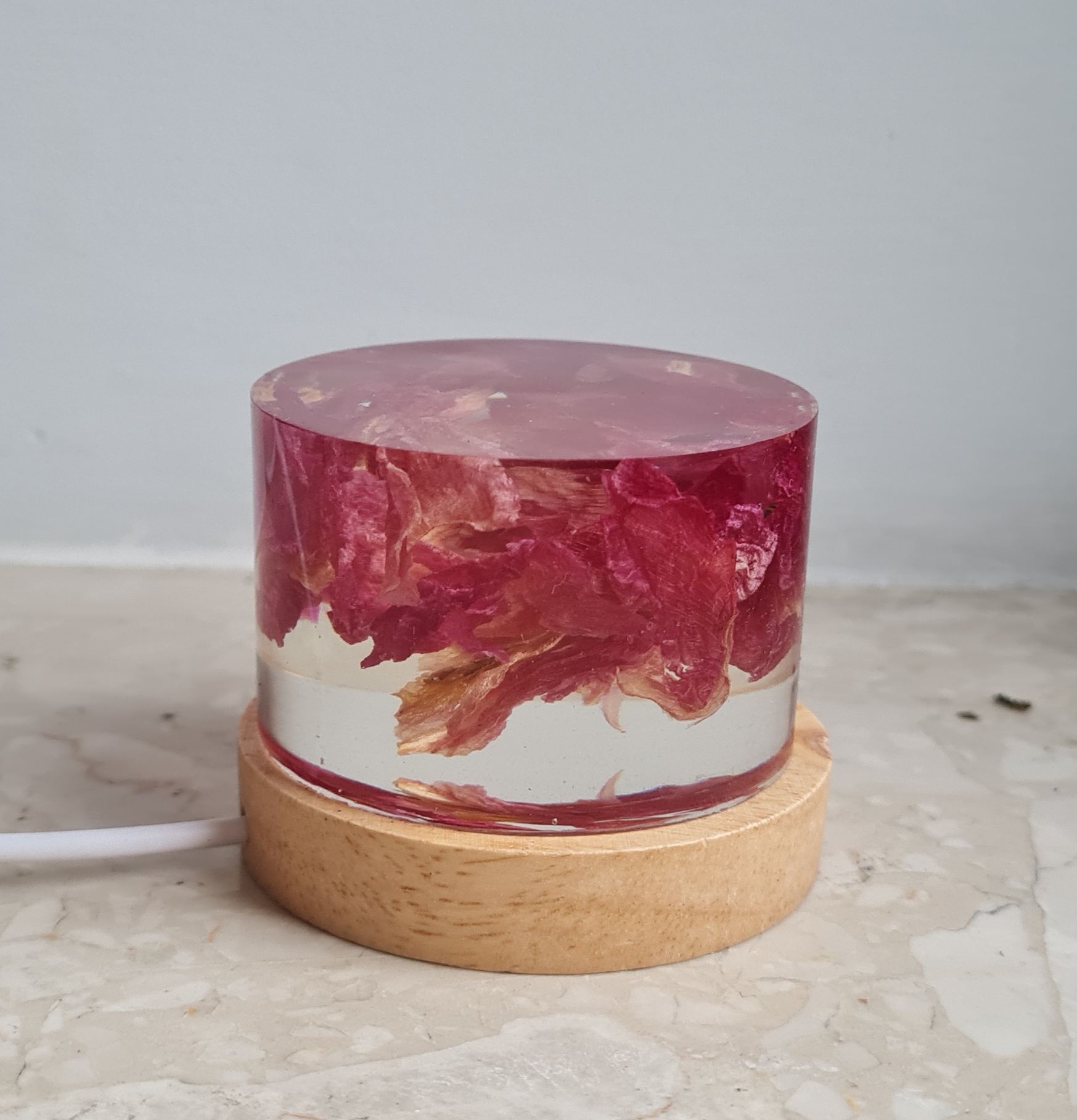 Lampka z zatopionymi kwiatami w żywicy epoksydowej.