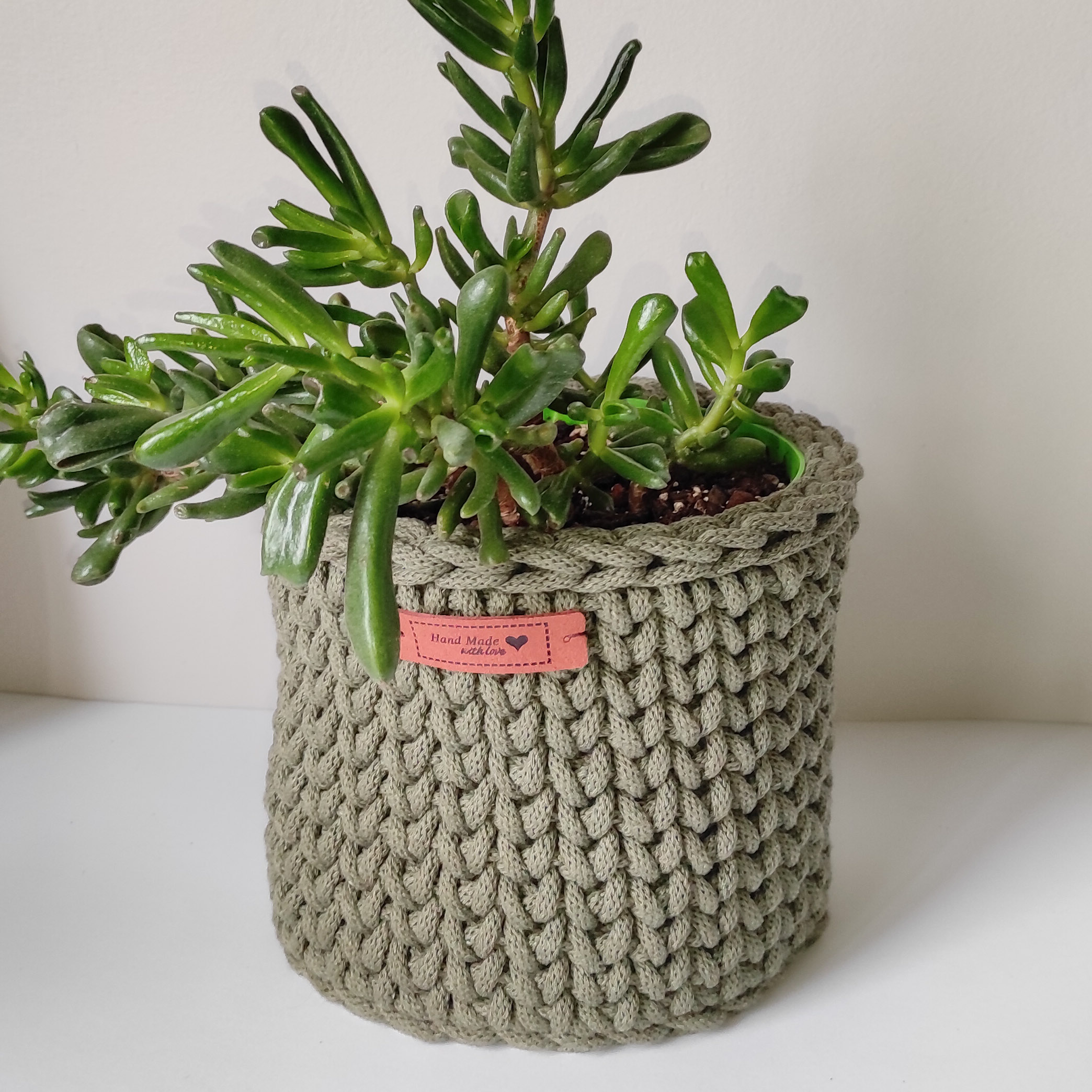 Ręcznie wykonana osłonka na doniczkę ze sznurka bawełnianego.